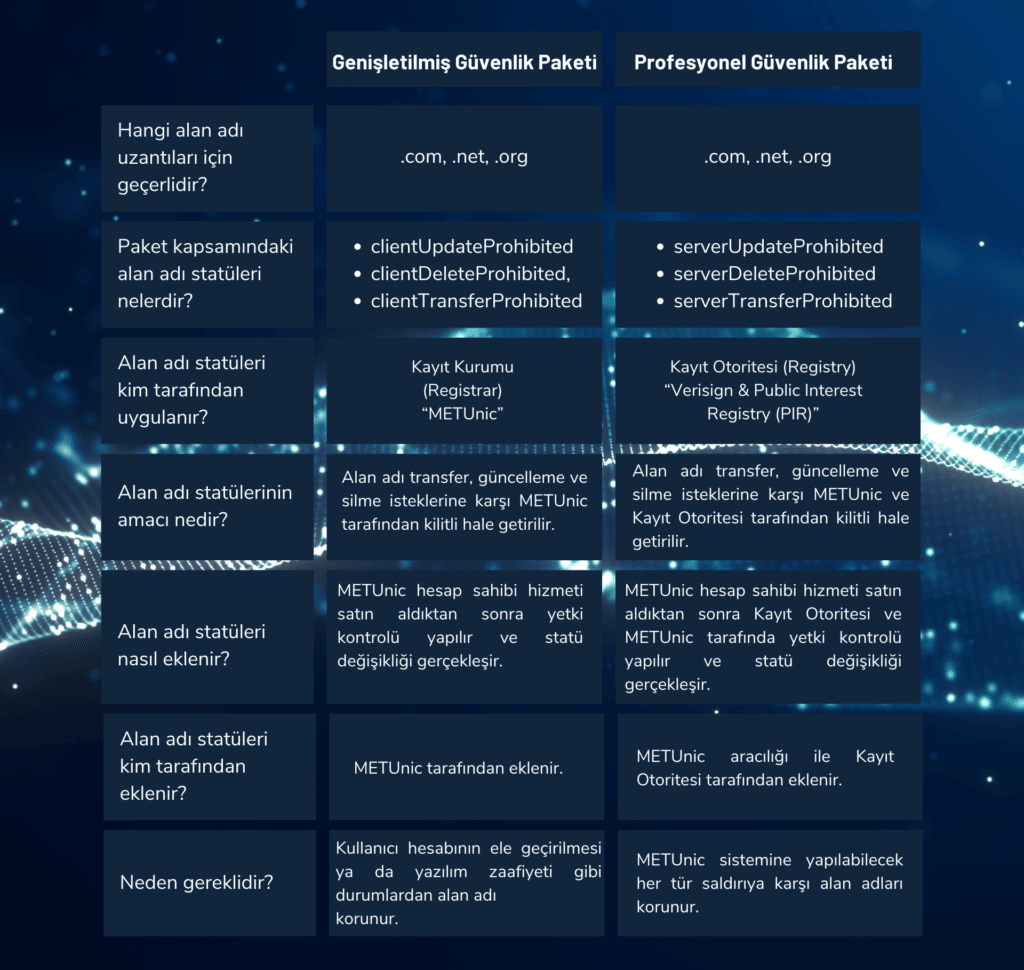 Bu paket kapsamında, alan adına yönelik yapılmak istenen transfer, güncelleme, silme gibi istekler METUnic (Registar) tarafından kilitli hale getirilir. Kritik alan adlarınız için kullanmanız önerilmektedir. Gelişmiş Güvenlik Paketi, markanızın dijital varlıklarını üst düzeyde koruma altına almak için tasarlanmıştır.
