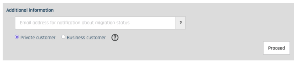 7) Alt bölümdeki alana süreçle ilgili bilgilendirme almak istediğiniz e-posta adresi eklenir. (Aktarım yapılan hesap olmaması önerilir.) “Proceed” seçeneği işaretlendikten sonra hesap bilgilerinin girileceği bir sonraki aşamaya geçilir.