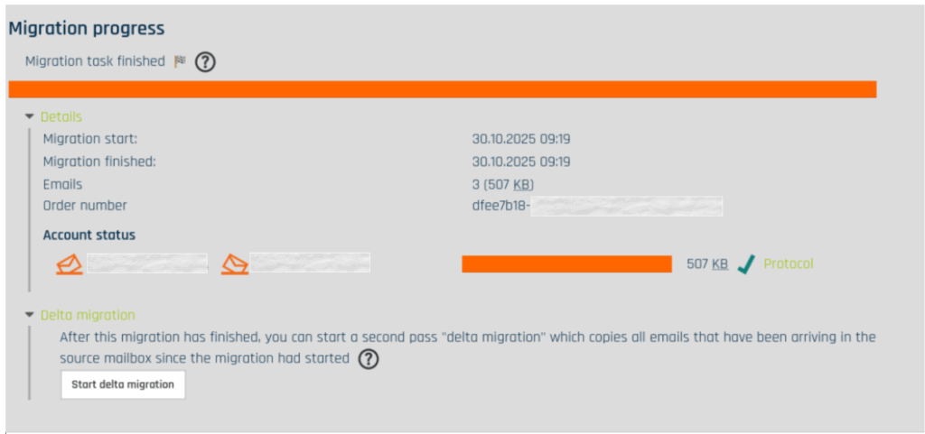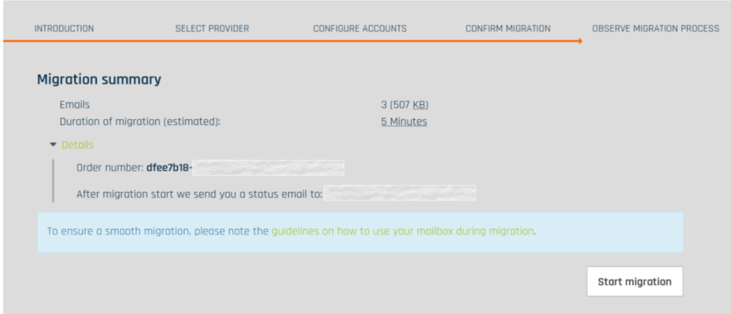11) Ekrandaki özet bilgiler gözden geçirilir ve “Start migration” butonuna basılarak taşıma süreci başlatılır.