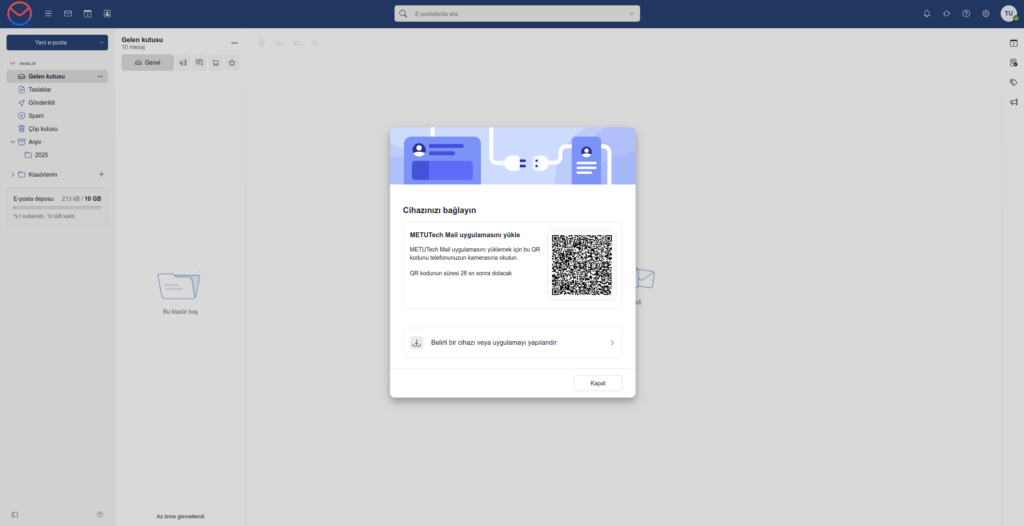 Not: Bu ekranda yer alan QR kod yalnızca METUnic mobil uygulamasının kurulumu içindir. Outlook, Gmail veya Thunderbird gibi üçüncü parti e-posta istemcileri için QR kod kullanılmaz.