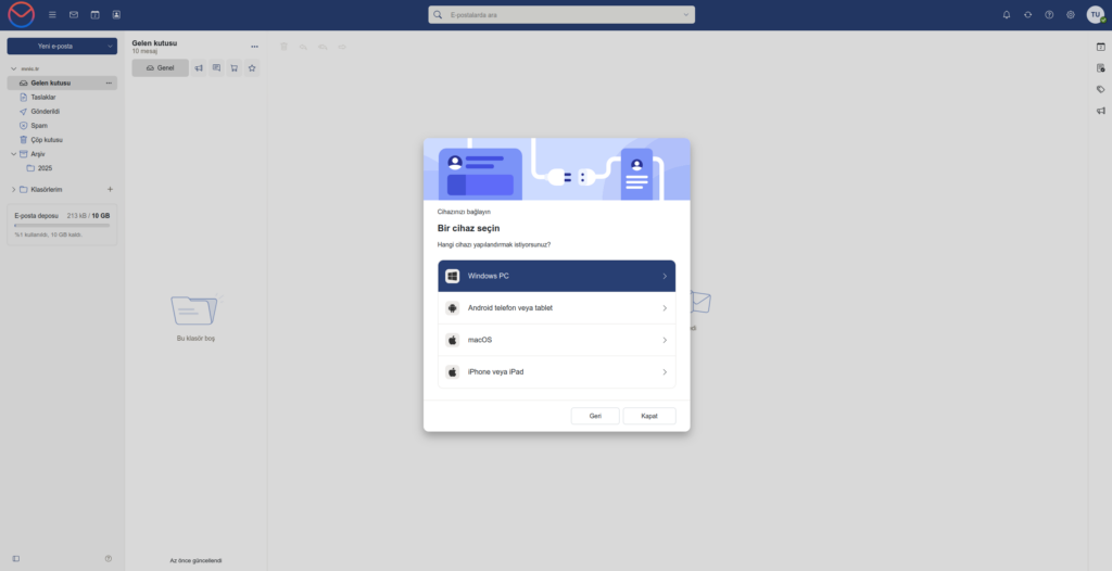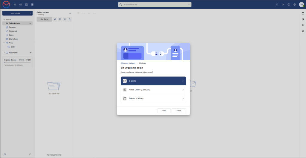 Bu ekran, e-posta hesabınızı farklı cihazlar ve uygulamalar üzerinde yapılandırmanızı sağlar. (Bkz. Görsel 1)