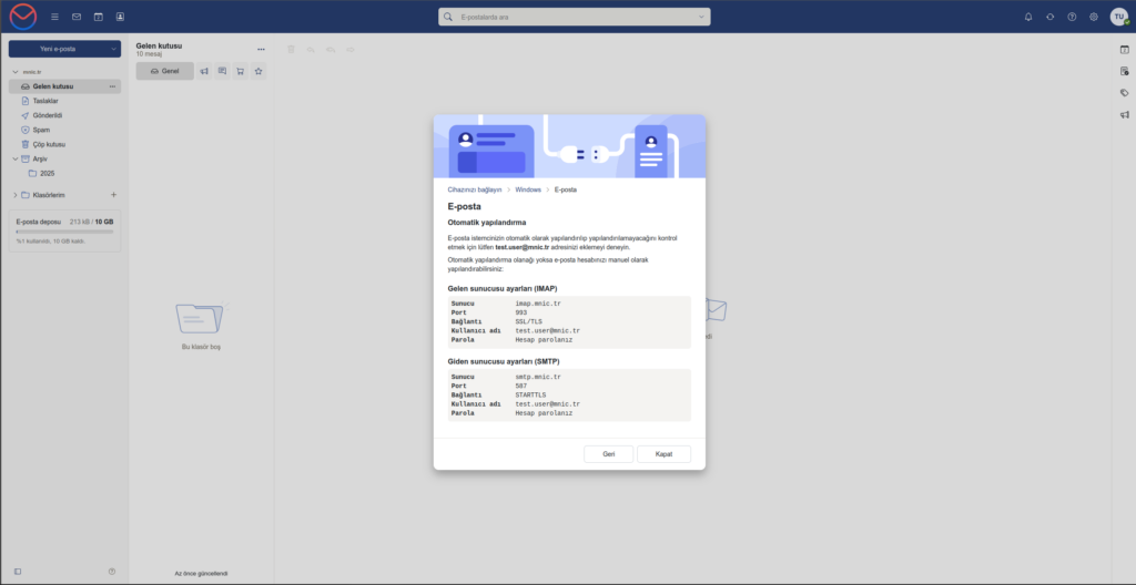 Yukarıdaki bilgilerin doğru şekilde girilmesi sonrası e‑posta hesabınız ilgili mail istemcisi üzerinde aktif hale gelecektir.